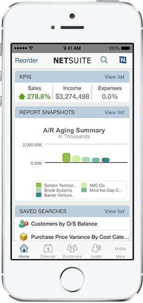 NetSuite for iPhone, a native iPhone application, is available as a free download from the Apple App Store giving on-the-go business users complete and personalised access to NetSuite’s integrated business management suite. This includes dashboard synchronisation of KPI metrics, scorecards and graphs, as well as complete record support including creation and modification. You can conduct business on the go, including sales order approvals, estimate conversions, billings and more. NetSuite has taken mobility to the next level. NetSuite’s iPhone app now offers Apple Watch integration. Just glance at your watch and you'll see key alerts anytime, anywhere.