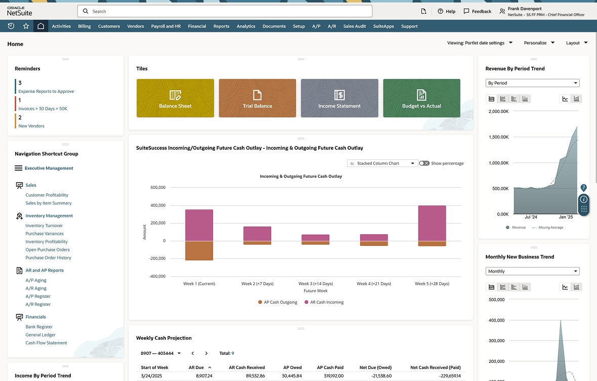 Ease cash flow management with real-time views of your cash positions and the ability to generate fast and accurate near-term forecasts with the NetSuite Cash 360 Dashboard. Predict future cash trends and perform what-if analyses to estimate the impact of planned expenditures, factor in additional funding sources and generate forecasts that include current and historical data.