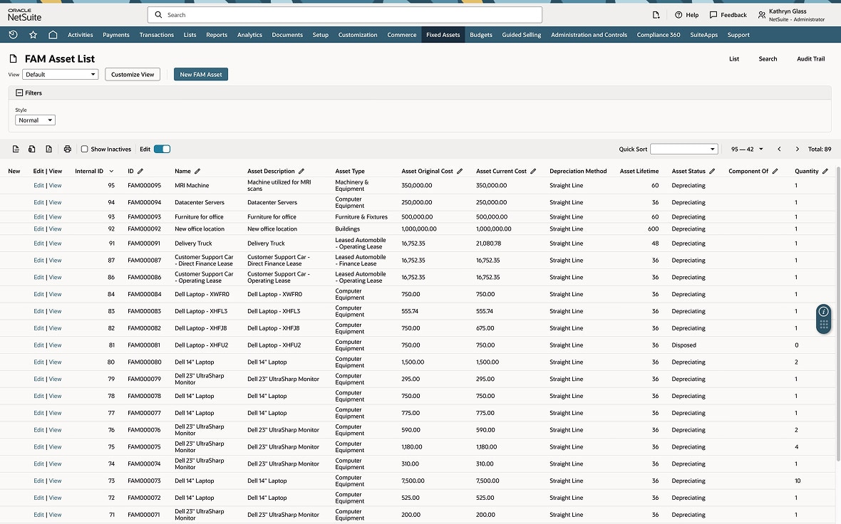 NetSuite Fixed Assets Management covers the entire asset lifecycle, from procurement to disposal, helping companies maintain up-to-date records, accurately record depreciation data and comply with lease accounting standards. Fixed Assets Management works seamlessly with NetSuite Procurement and Advanced Financial Management to automate the creation of new assets and posting of depreciation and lease expenses.