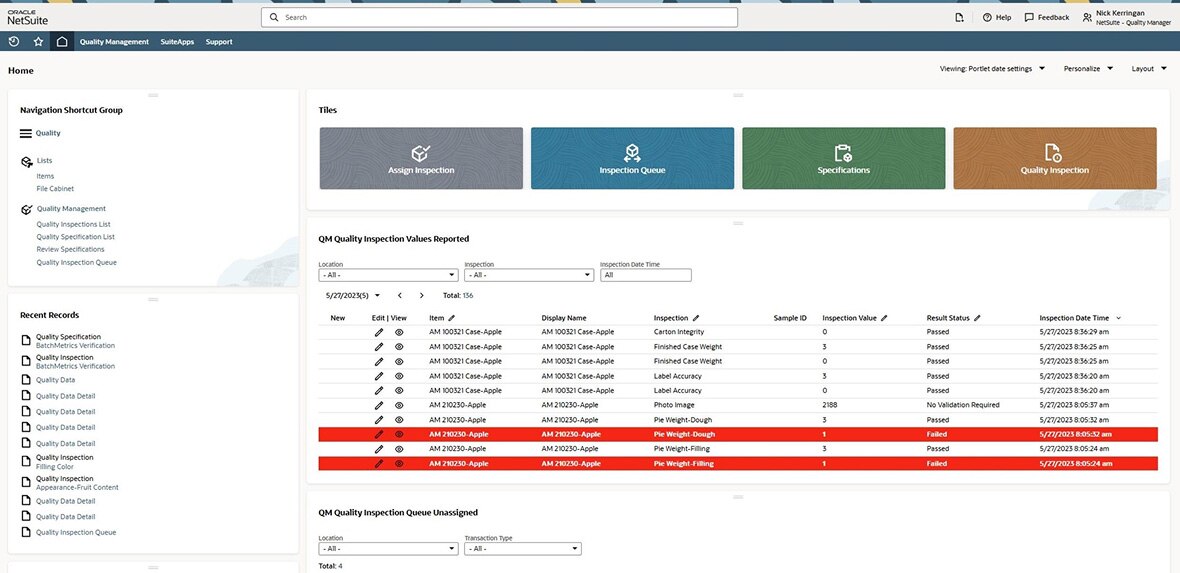 NetSuite provides a master list of predefined profiles that specify the type of inspection to be performed, acceptable limits, the minimum qualifications of the inspector and the category and method of inspection. This enables businesses to enforce standards on inspector credentials, capture measurements and compare data to pass/fail limits. Each inspection can be set up with multiple data elements that define the parameters of the inspection process.